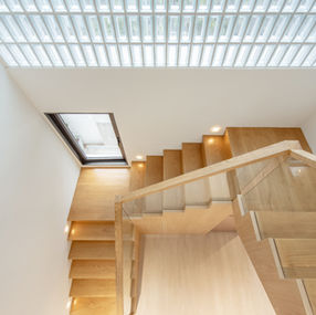 The old stairs turn into a living area for recreation, dining, and the family's main space by removing the inner walls combining small spaces into a wide connecting living area.